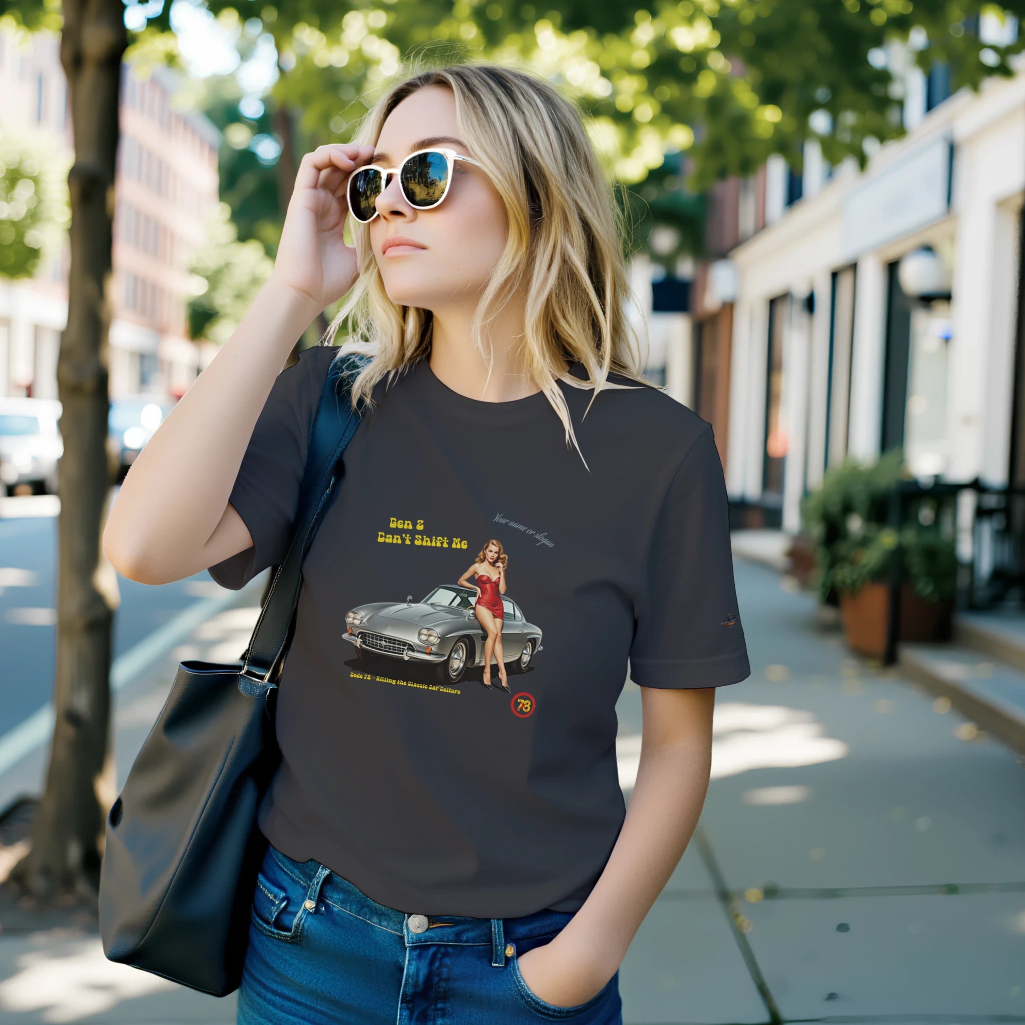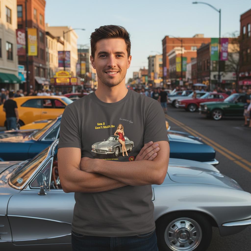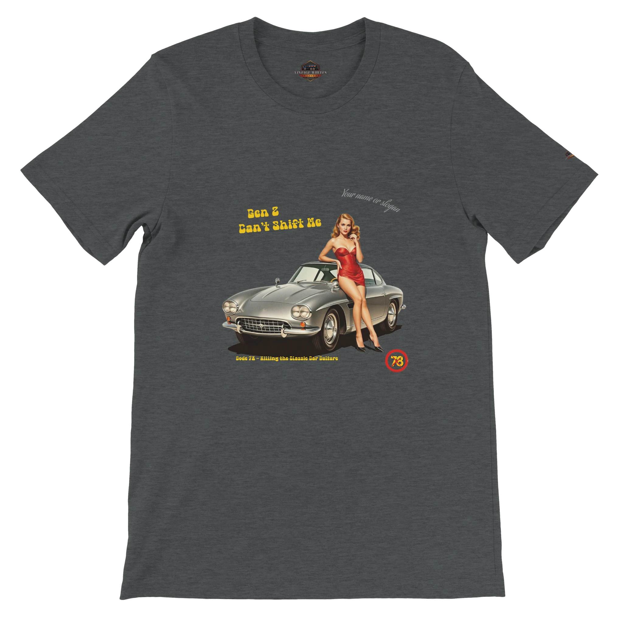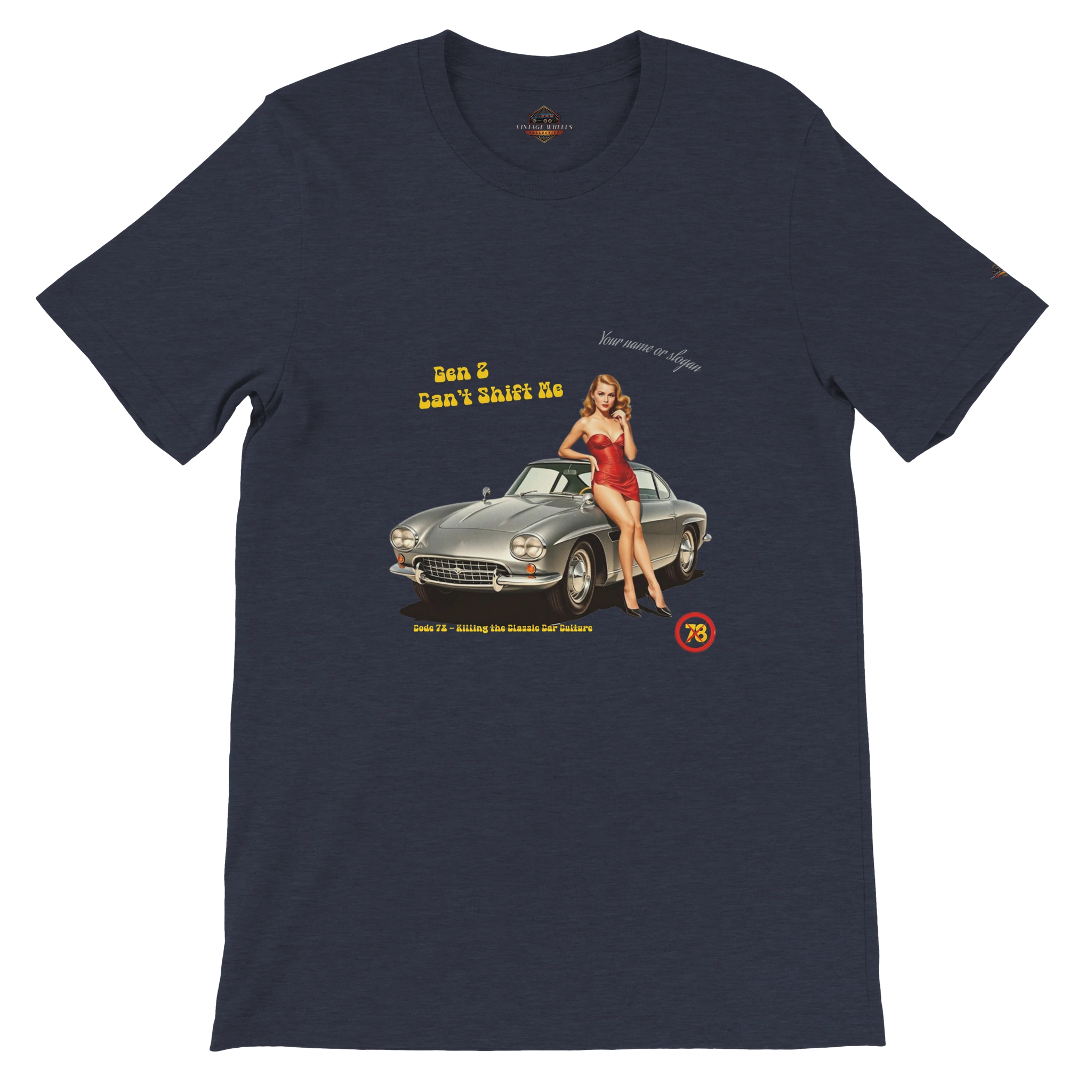 Turn up the heat and turn heads with this bold fusion of vintage glamour and gearhead rebellion. This premium round neck T-shirt features a sultry 1940s-style pin-up leaning into a gleaming classic car, delivering her cheeky challenge: “Gen Z Can't Shift Me”