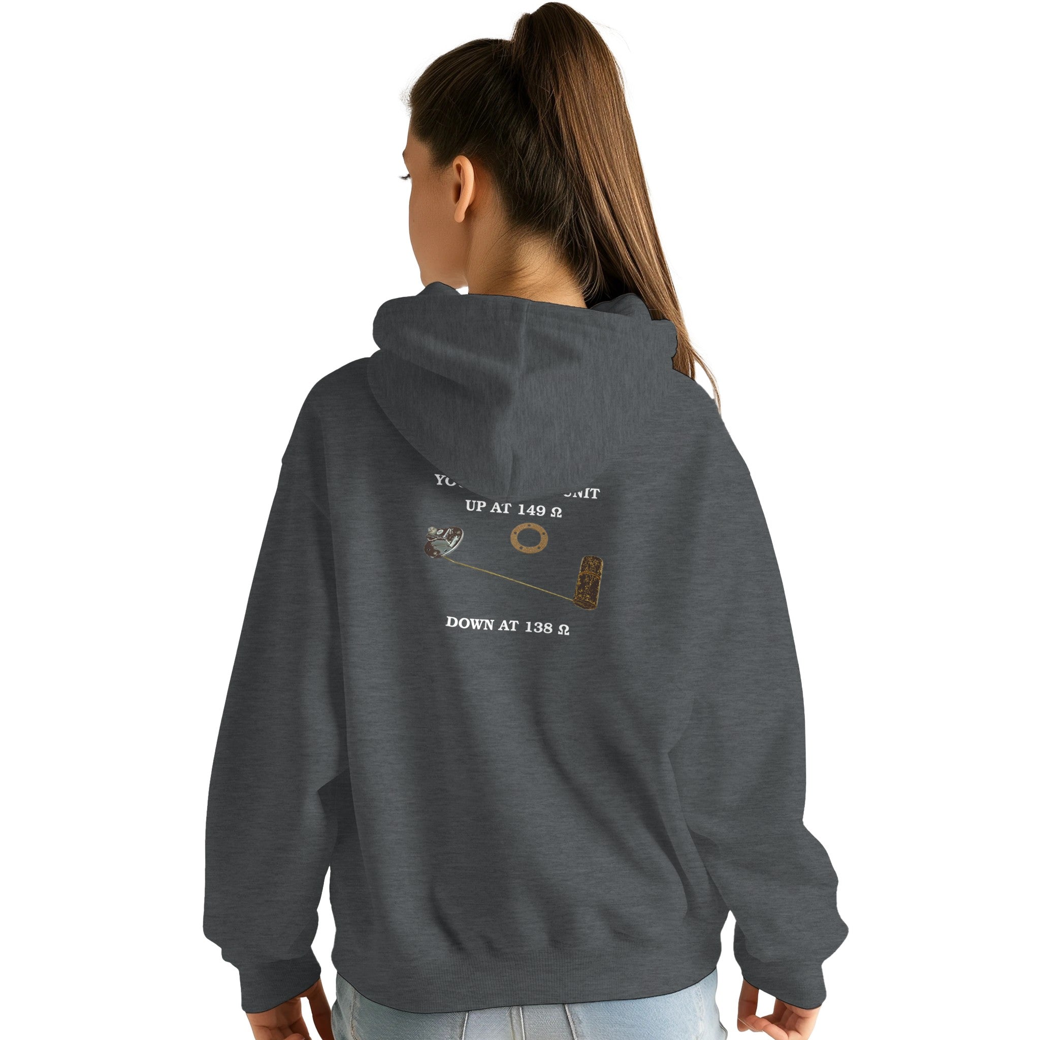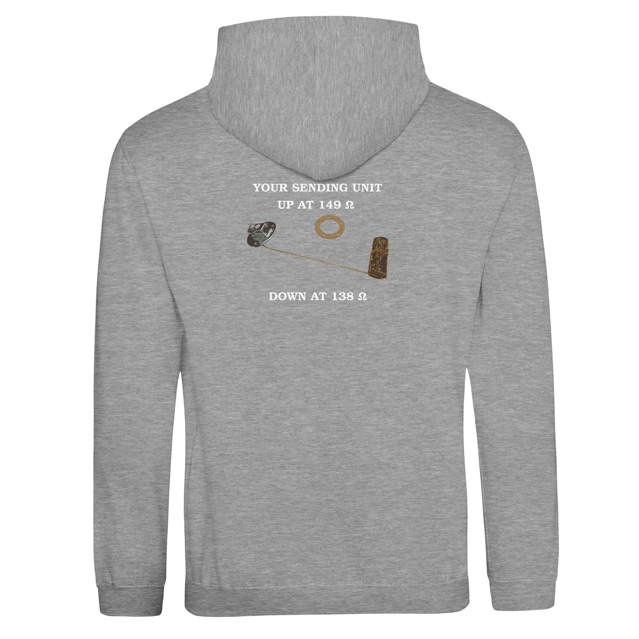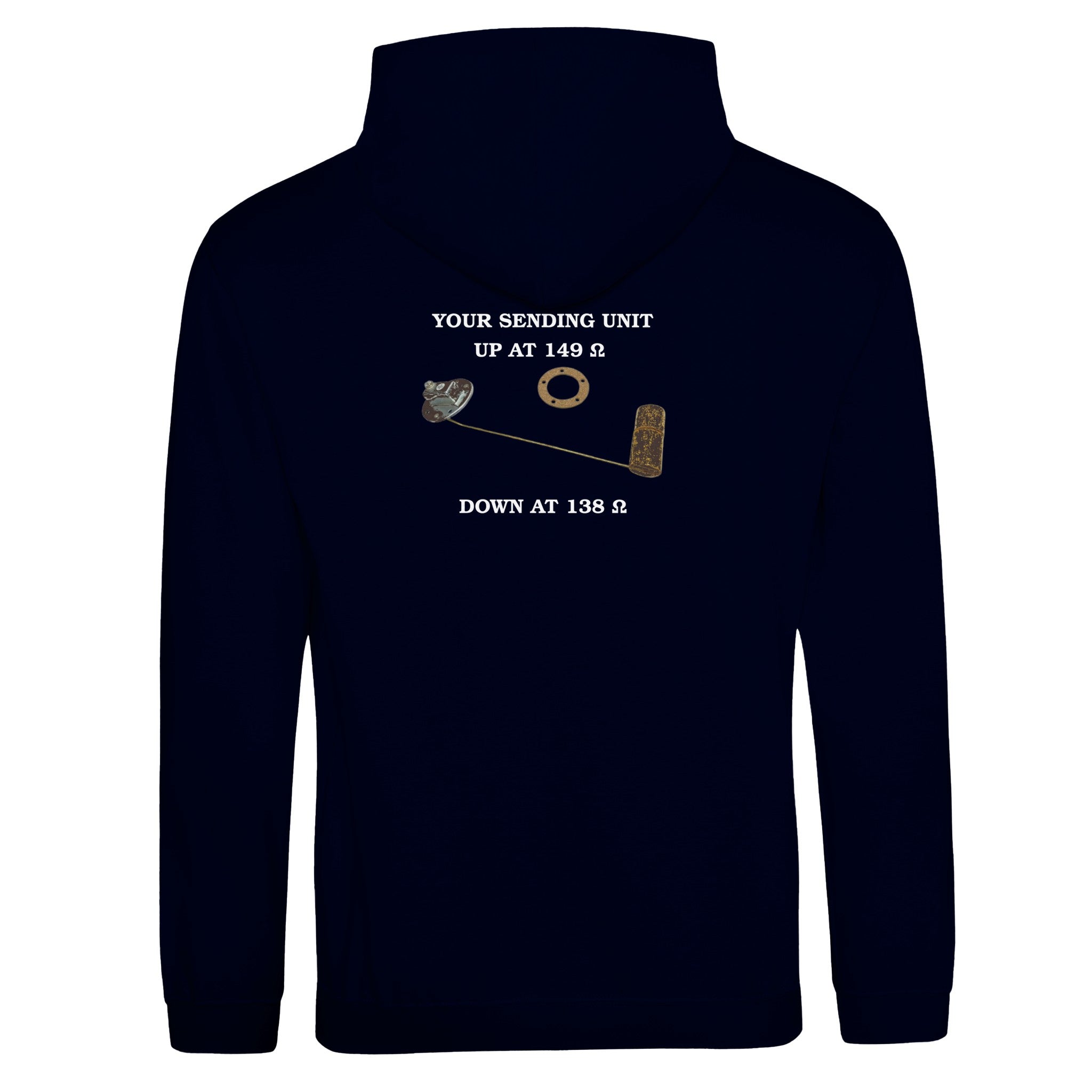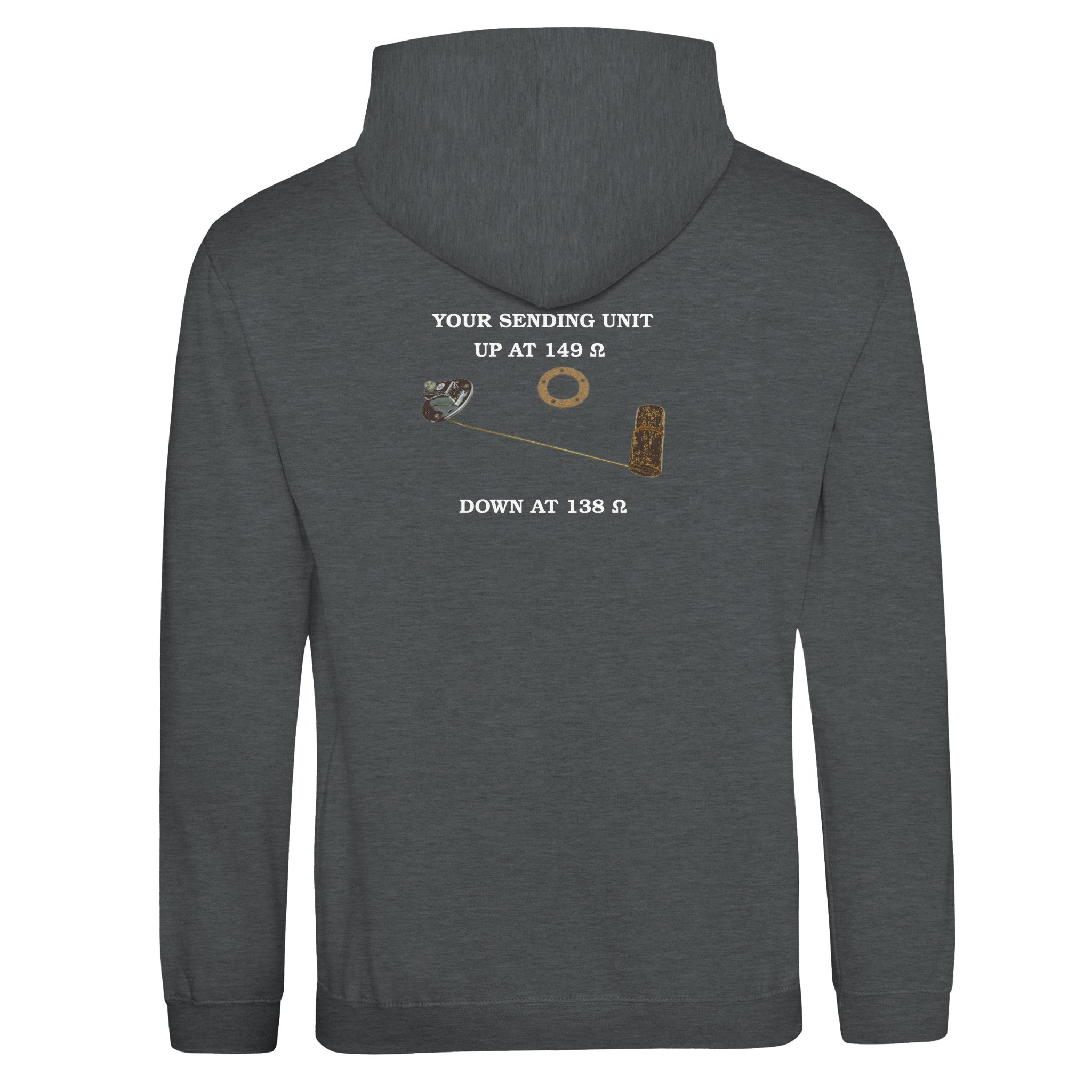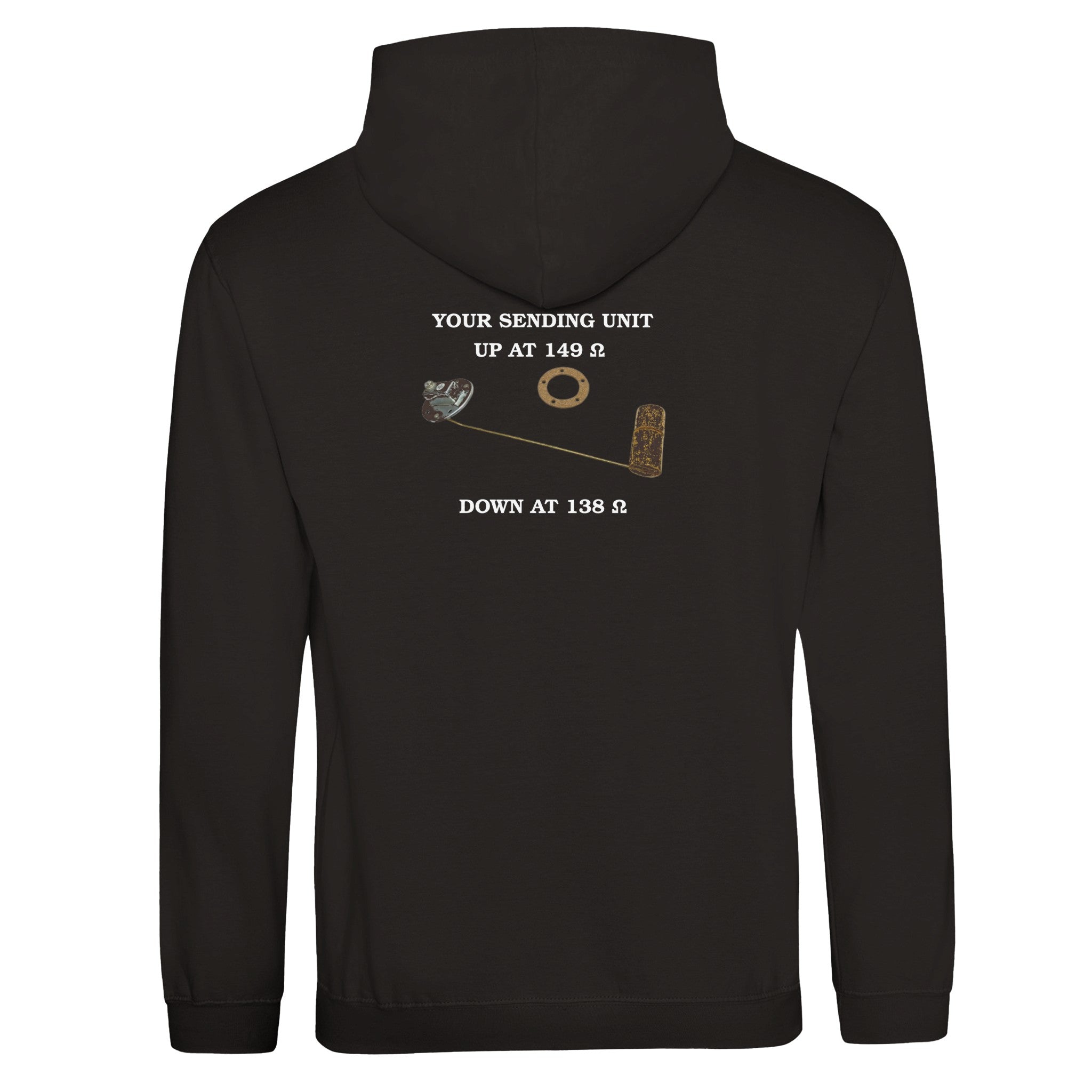 This isn’t just a hoodie — it’s a tribute to the unsung hero under your tank: the fuel sending unit. Before the age of digital guesswork, it was a float and a resistor that whispered to your fuel gauge. Now it’s a conversation starter, screen-printed across your back.