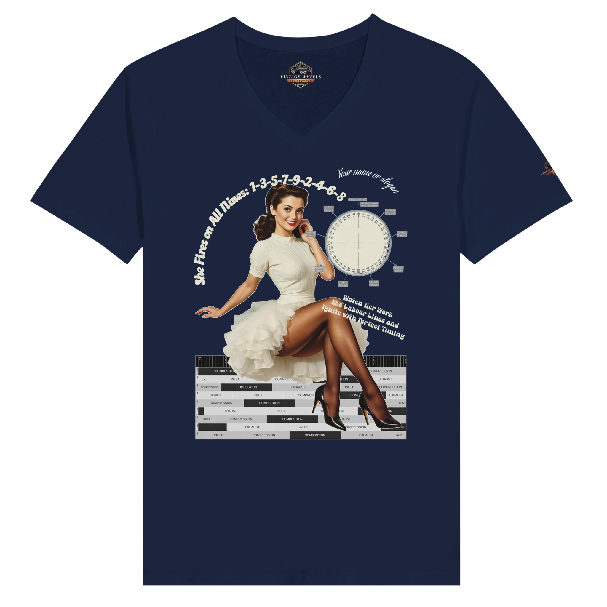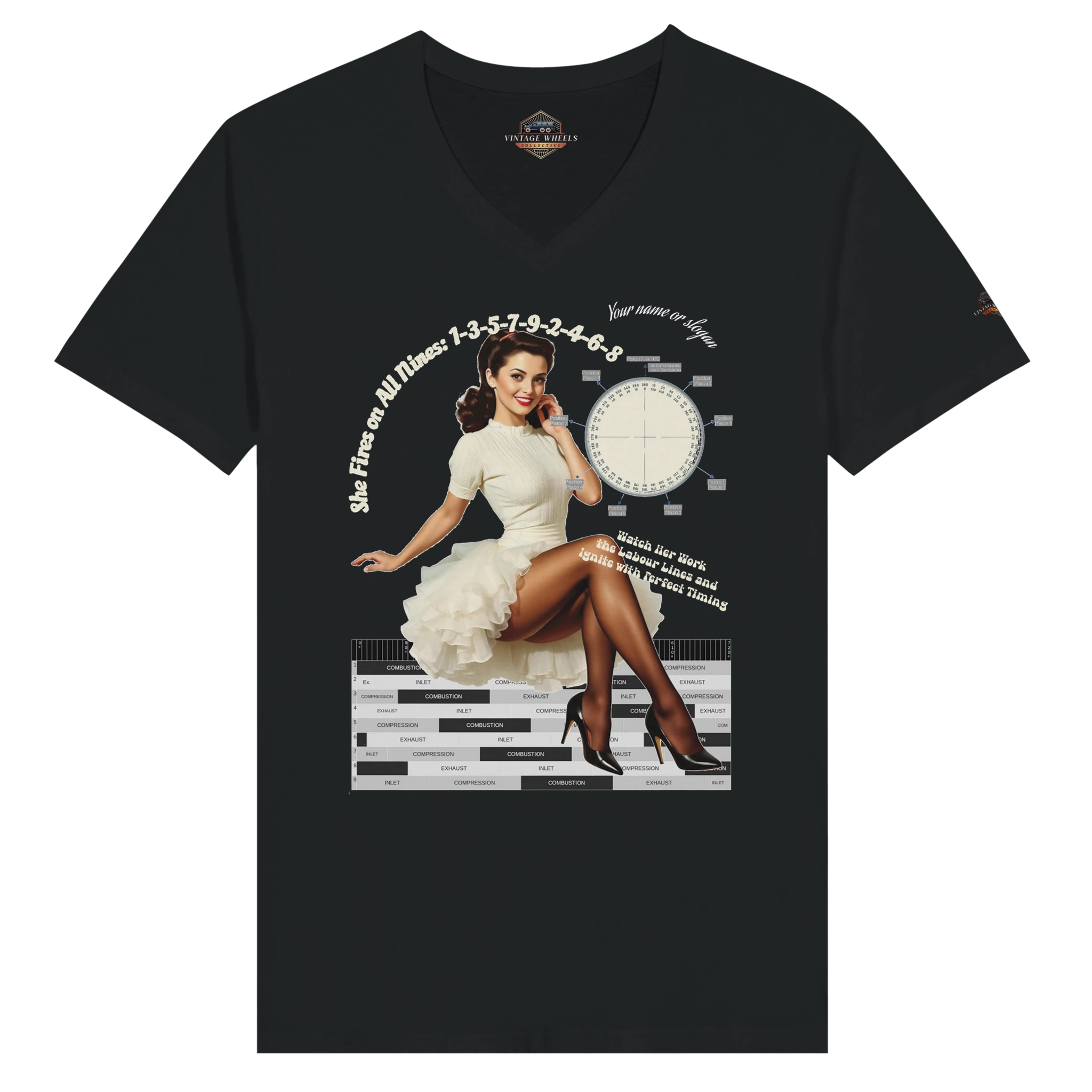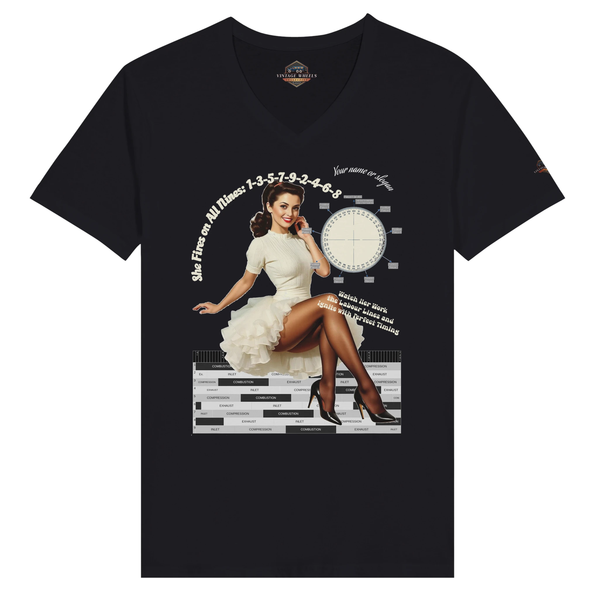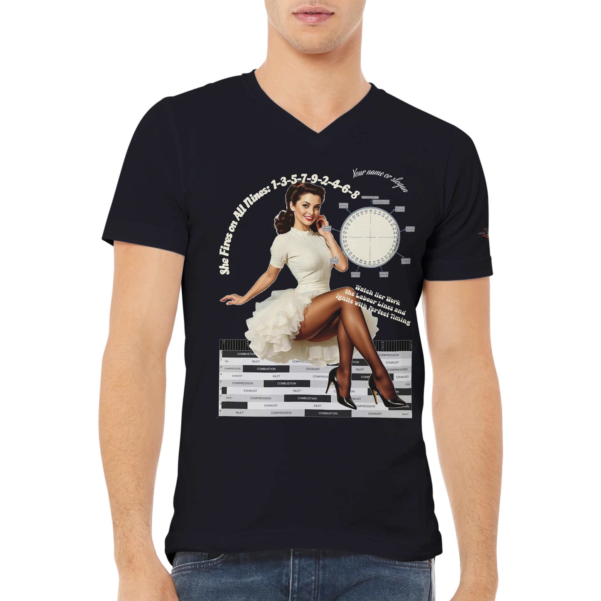 Turn heads in true vintage style with our "She Fires on All Nines" unisex V-Neck T-shirt — a bold tribute to 1940s pin-up art and the legendary Rolls-Royce 9-cylinder straight engine.