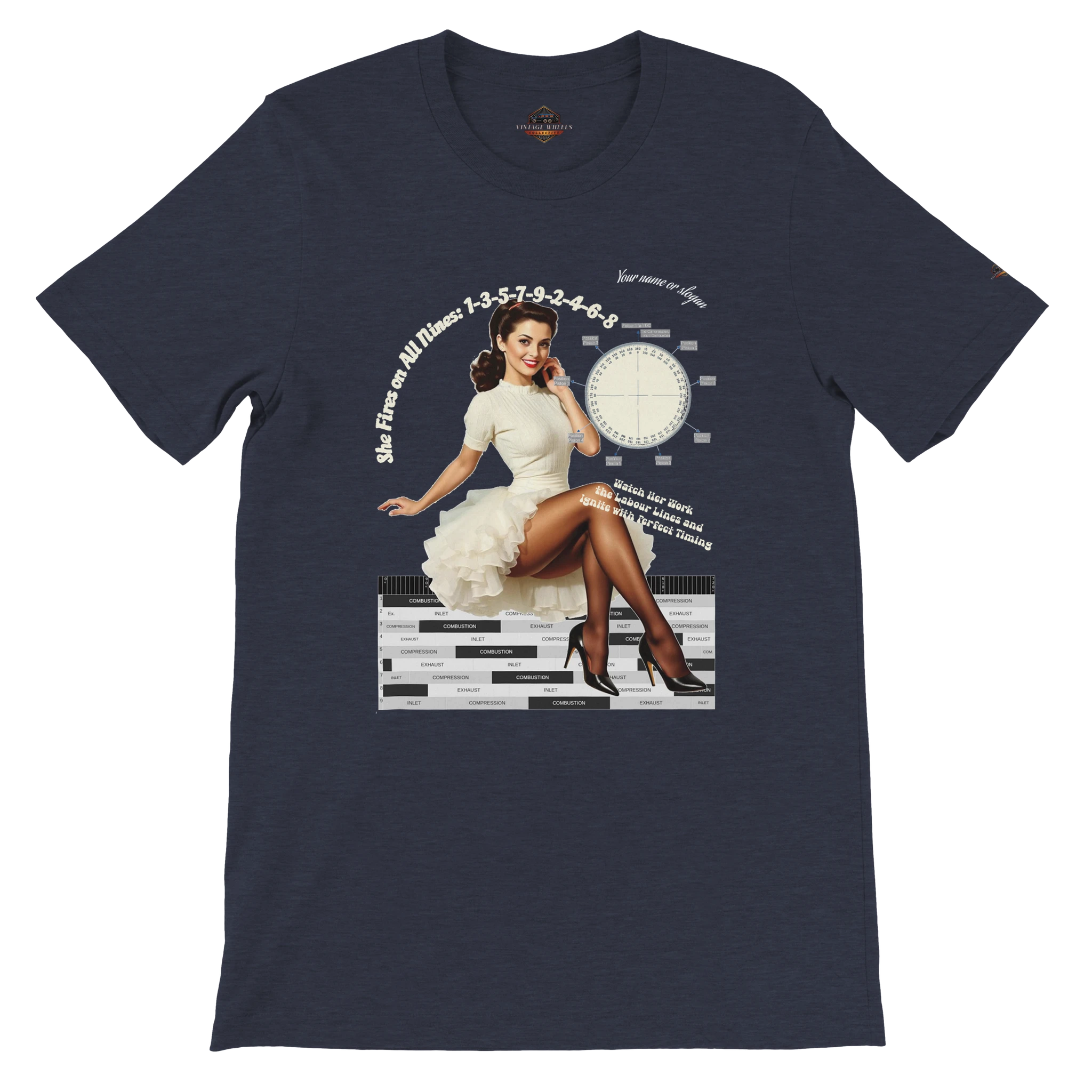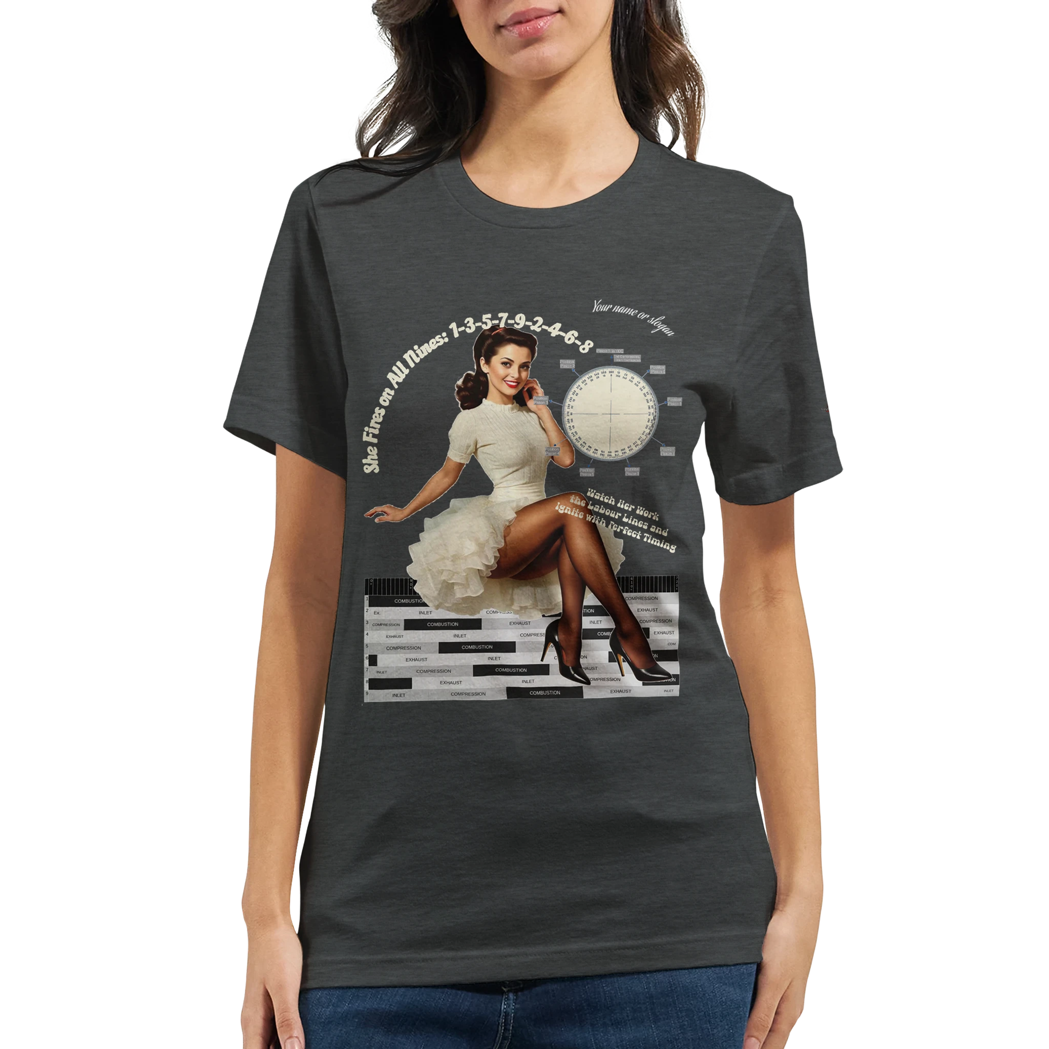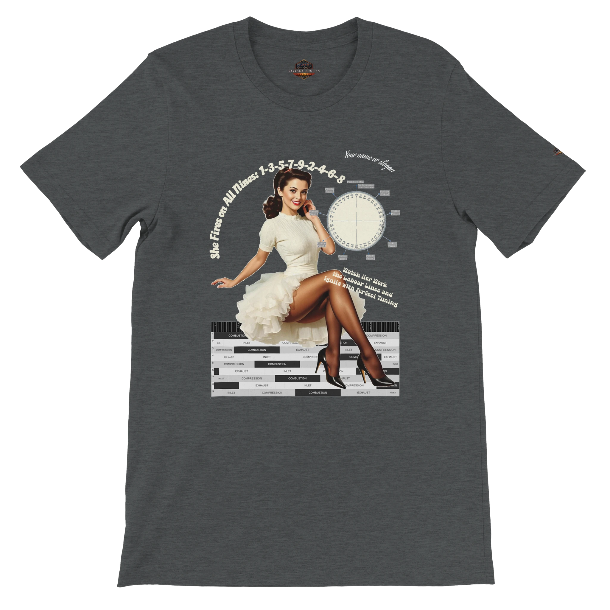 Featuring a stunning pin-up girl alongside authentic crank angle and labour (power) diagrams, this shirt blends mechanical precision with timeless curves. The iconic 1-3-5-7-9-2-4-6-8 firing order is proudly printed, celebrating the art of ignition and the beauty of perfect timing.