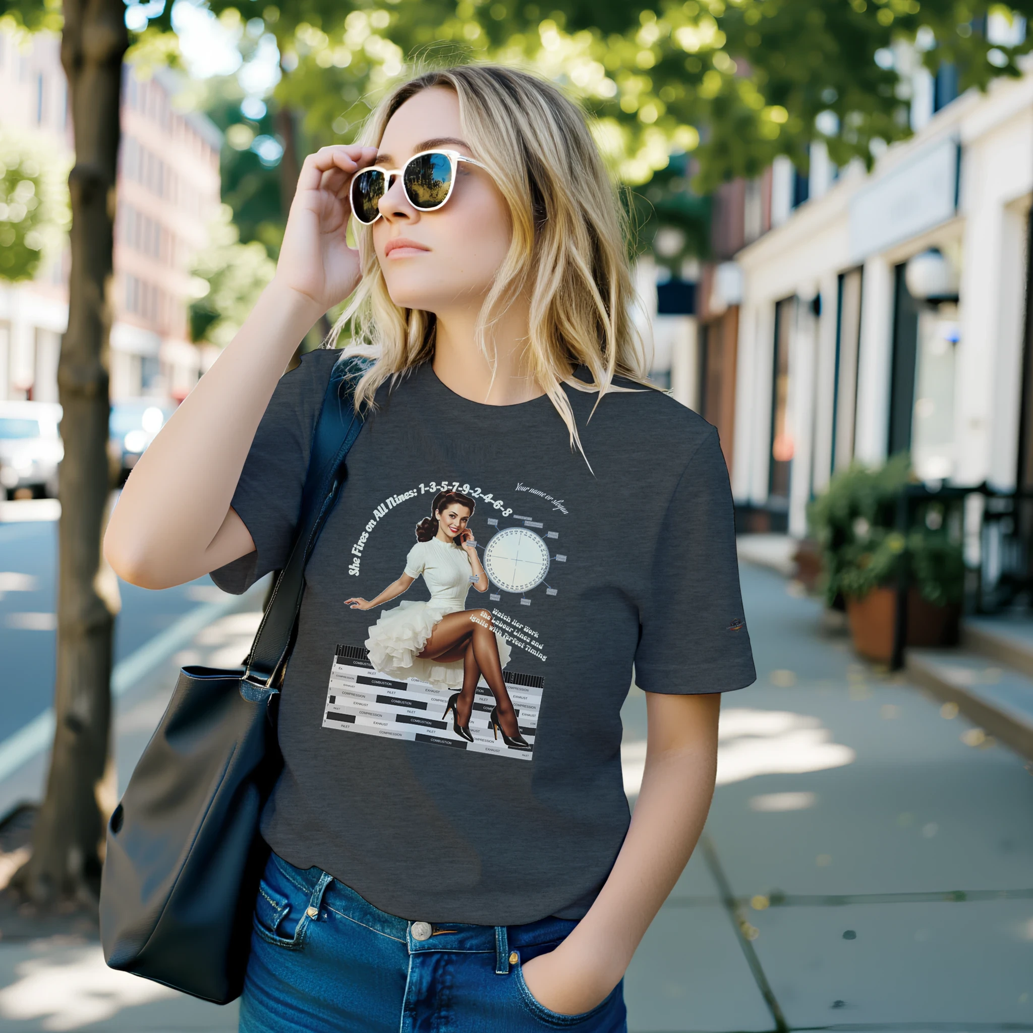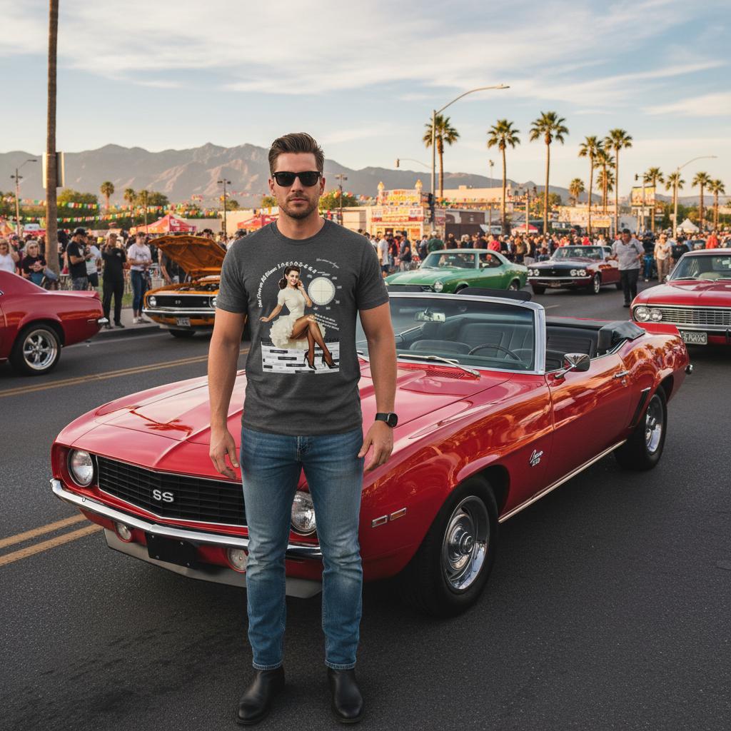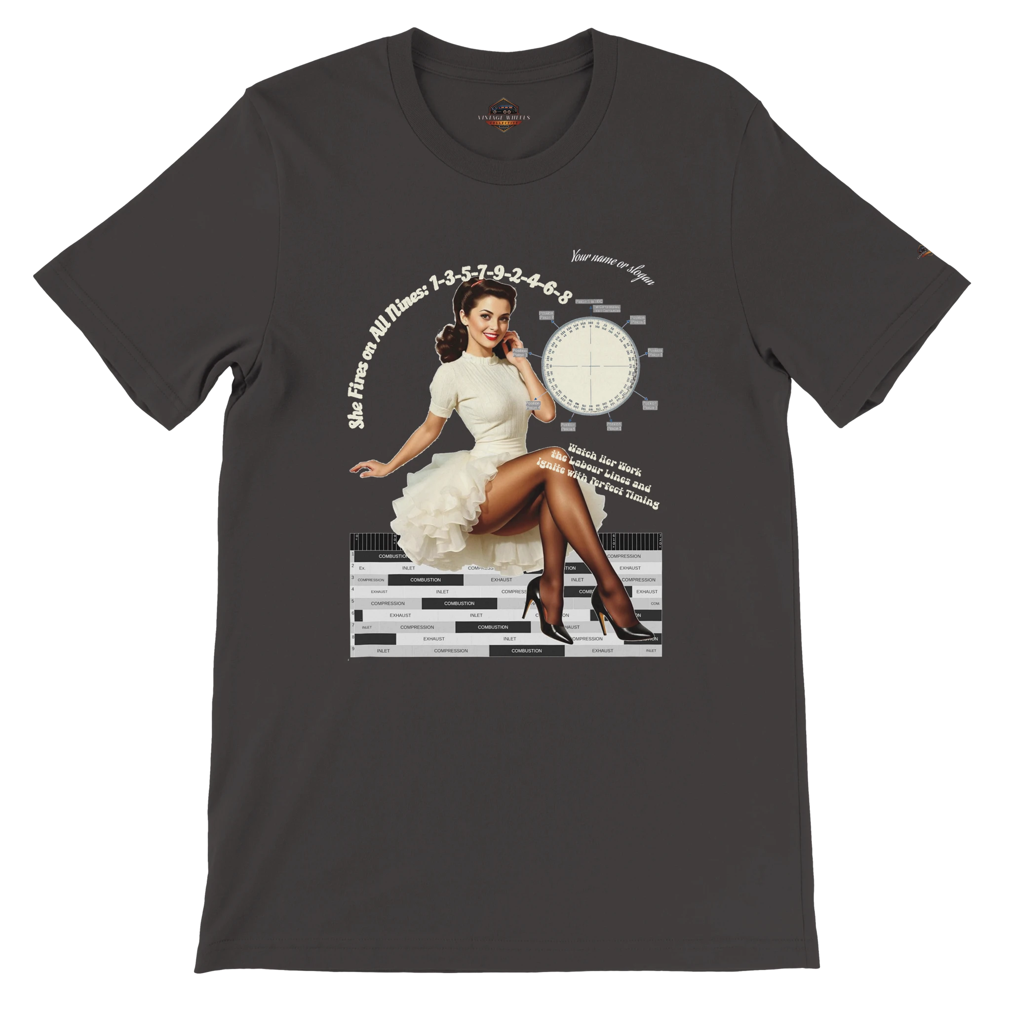 Featuring a stunning pin-up girl alongside authentic crank angle and labour (power) diagrams, this shirt blends mechanical precision with timeless curves. The iconic 1-3-5-7-9-2-4-6-8 firing order is proudly printed, celebrating the art of ignition and the beauty of perfect timing.