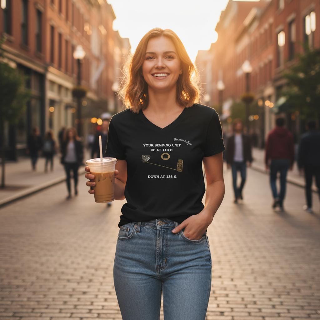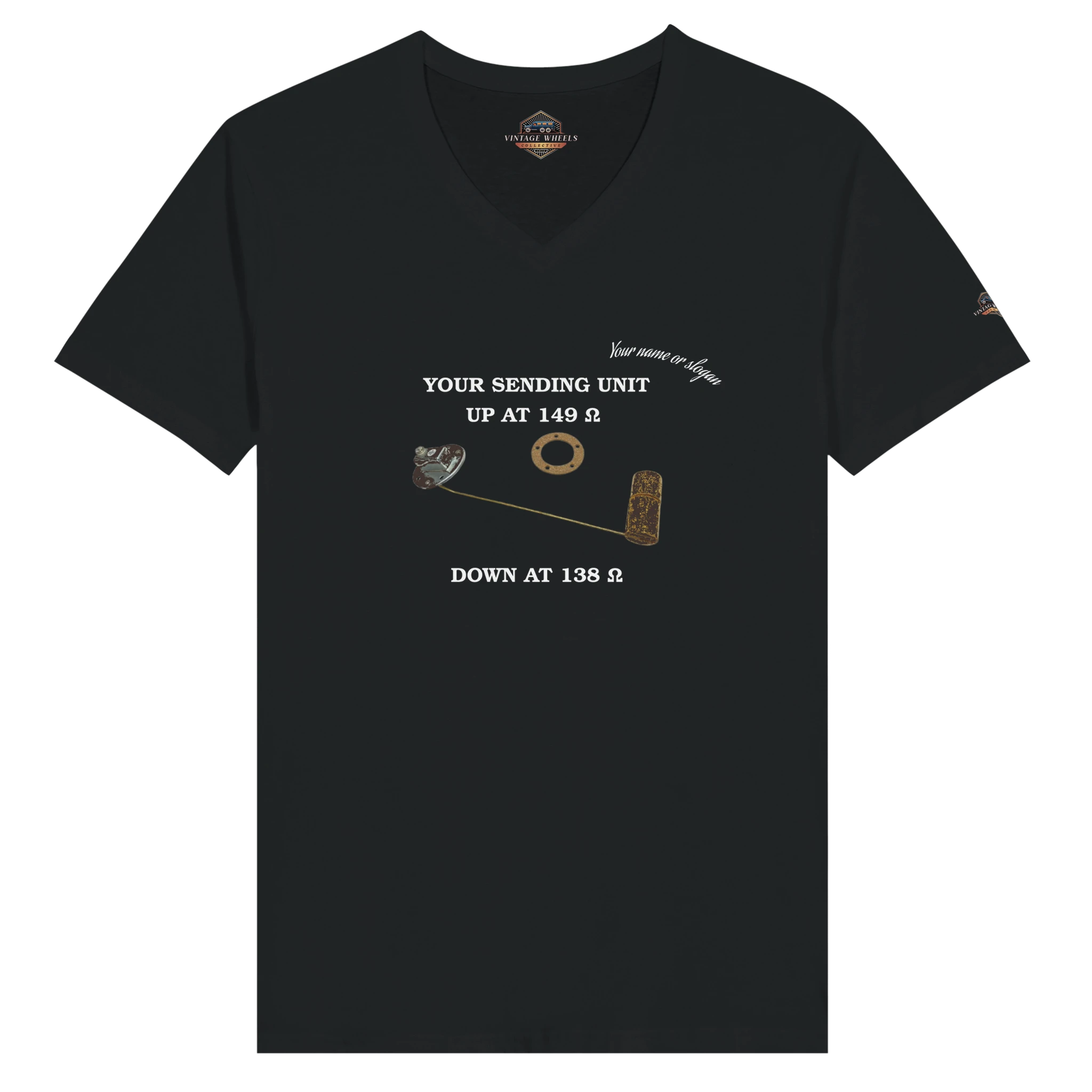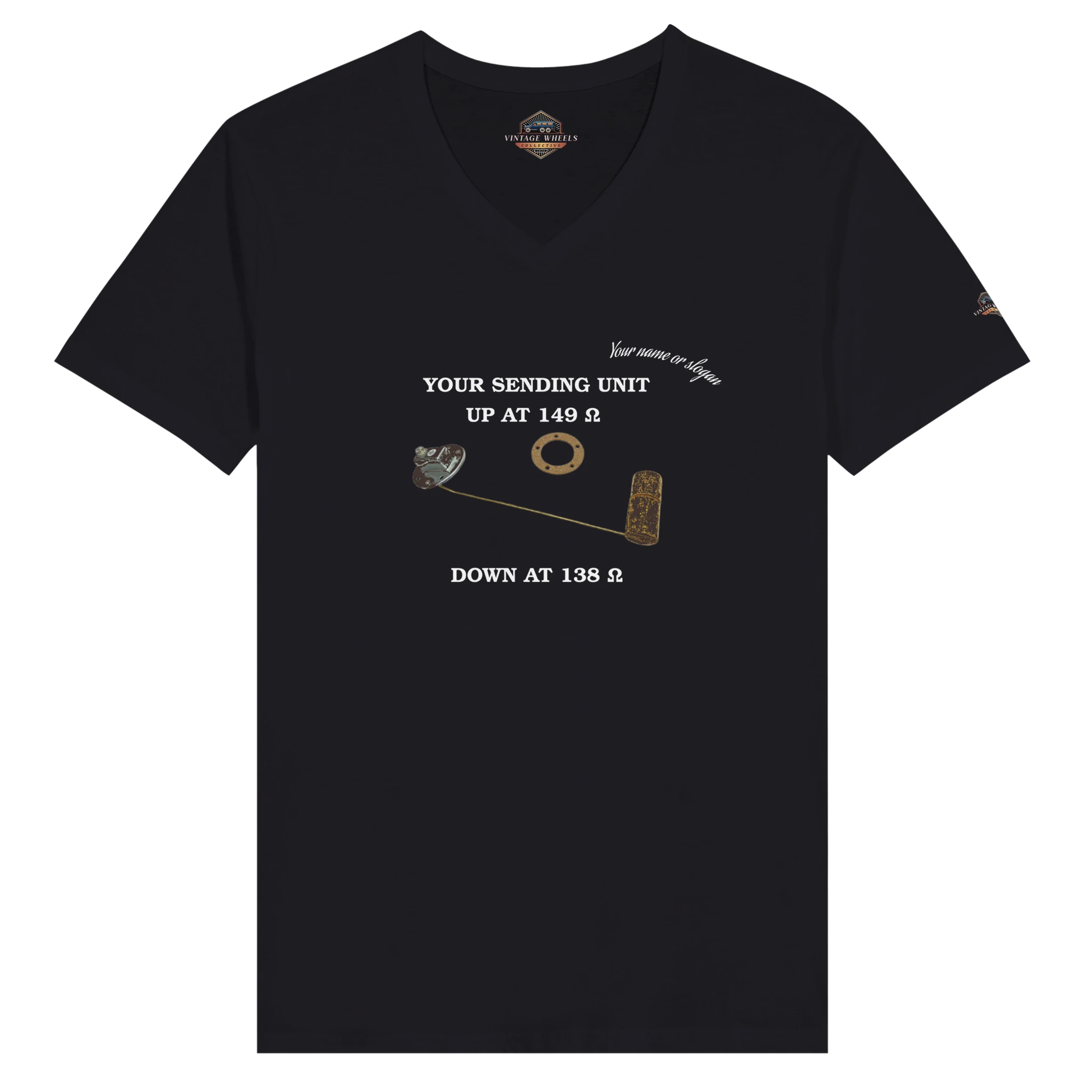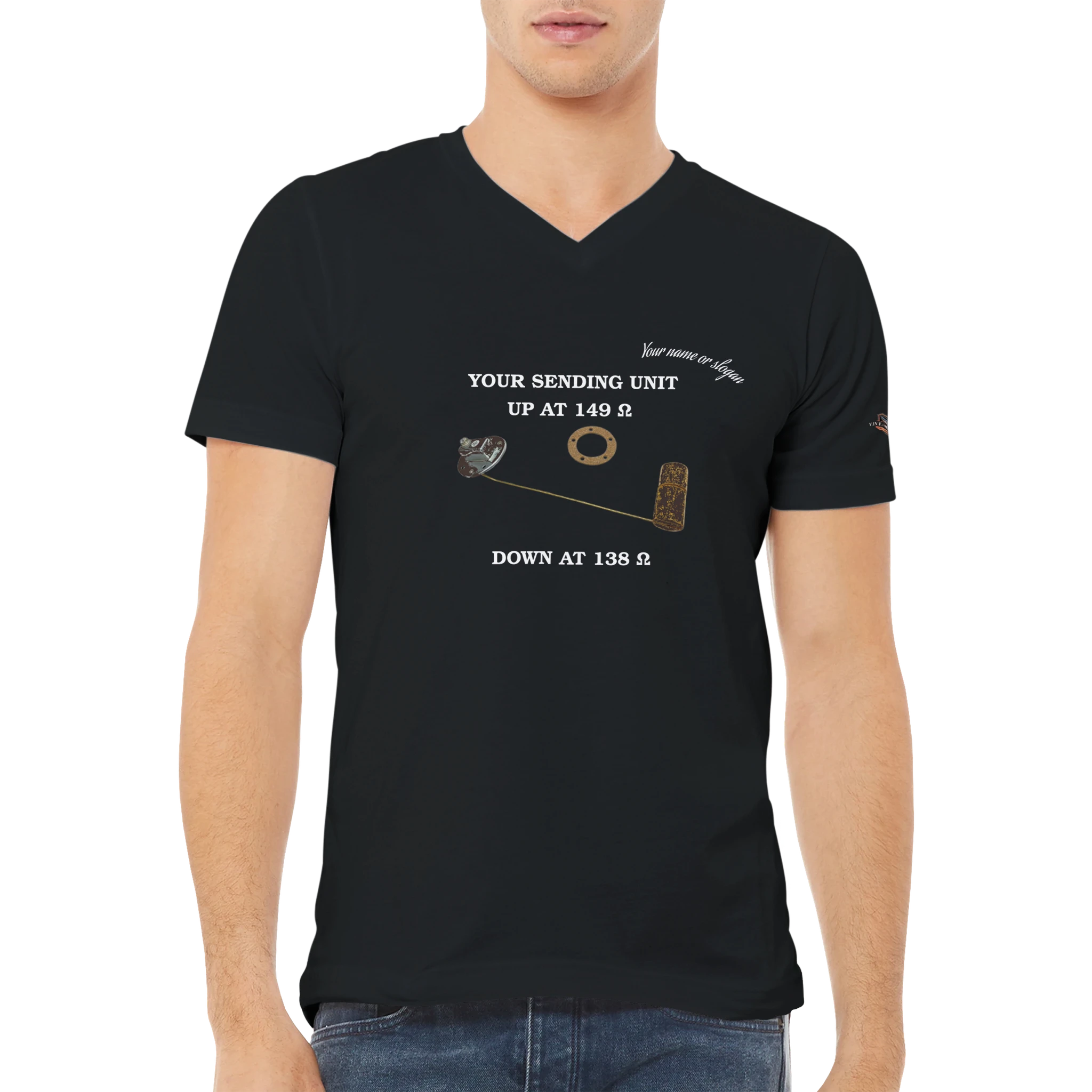 Celebrate the Unsung Hero of Classic Cars - The Still Sending Signals – Vintage V-Neck Edition Tee is a Tribute to the Unsung Hero Under the Tank. It pays a homage to a vital yet often overlooked component of vintage automobiles: the fuel sending unit. This unisex T-shirt features a detailed illustration of this essential part, complete with resistance values, capturing the intricate beauty of automotive engineering.